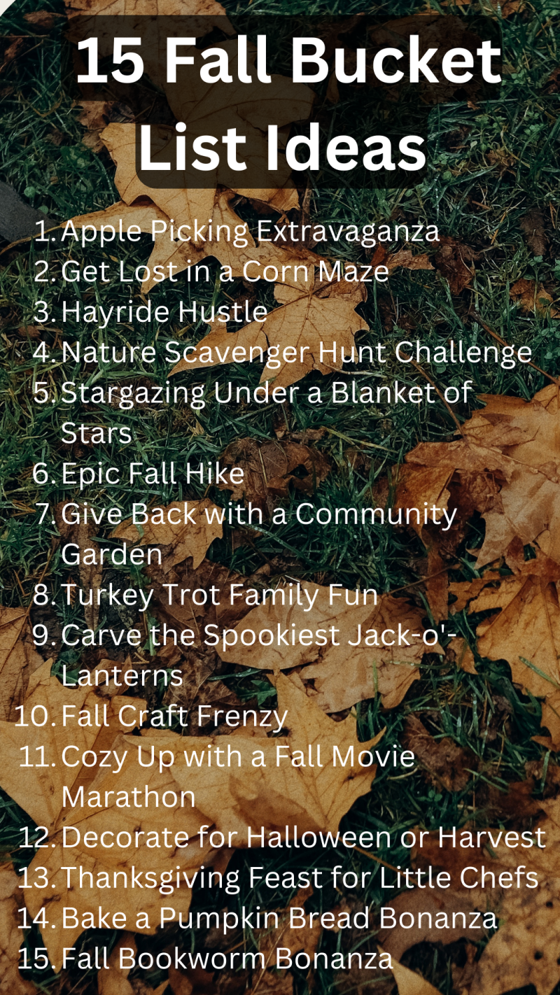 - Make a Fall Bucket List Together! Get the whole family involved by creating a fall bucket list together. Write down all the activities you want to do this season and check them off as you go! It'll add a sense of accomplishment and excitement to your fall adventures.